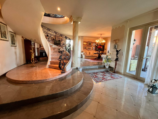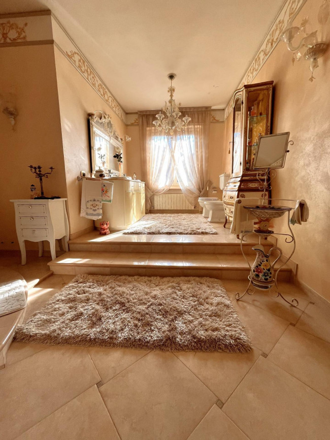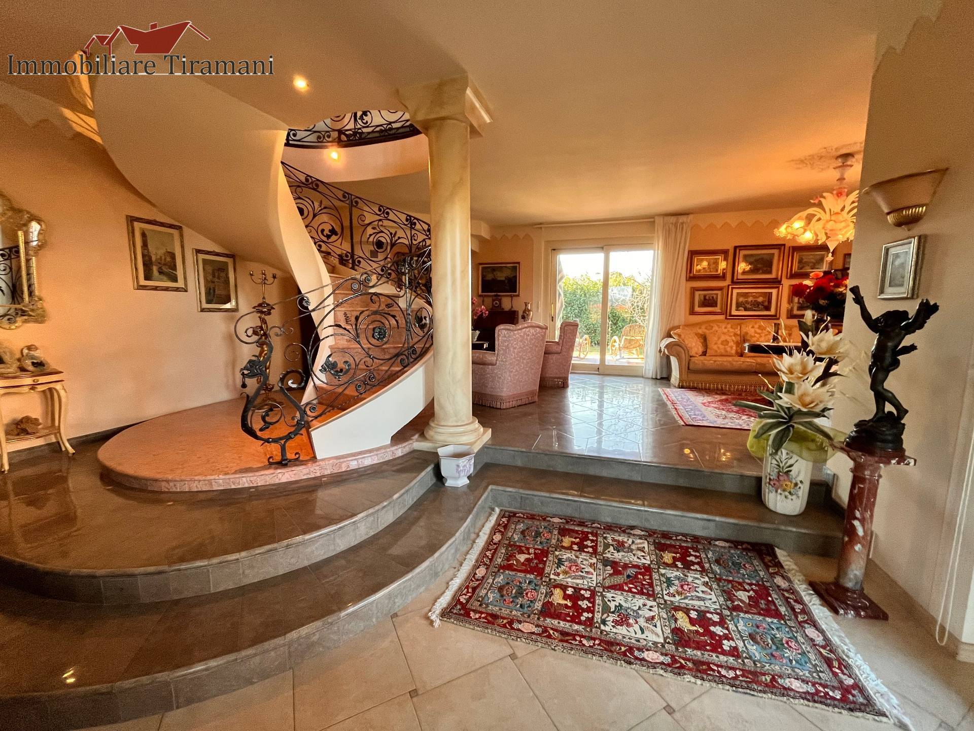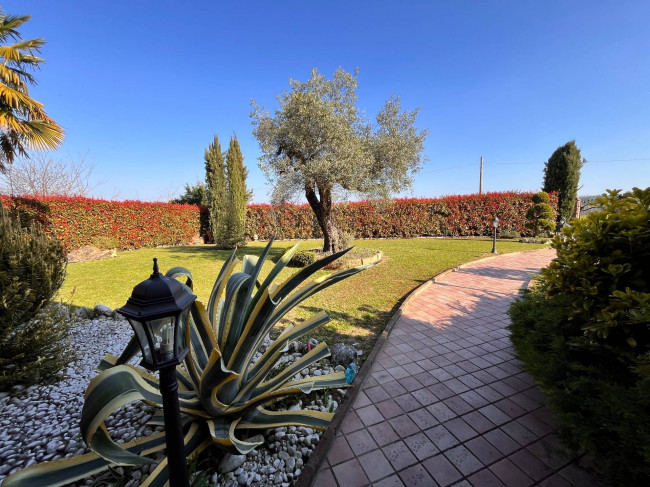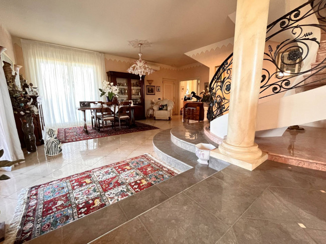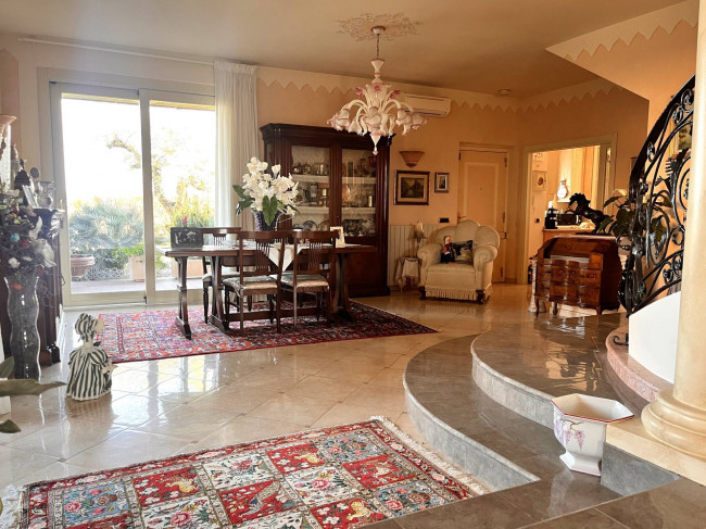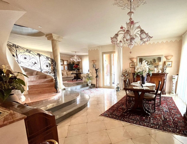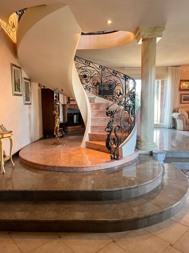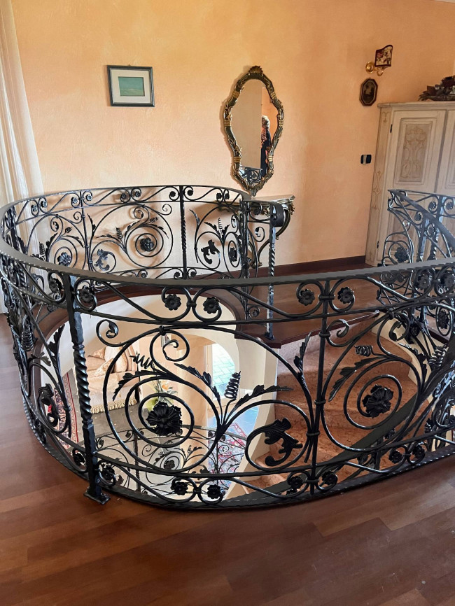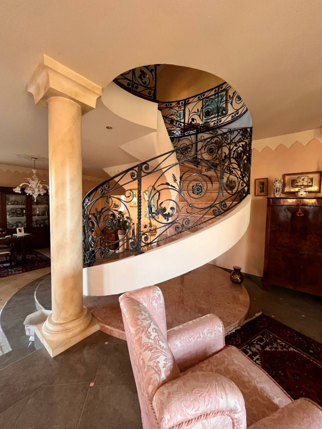 Circondata da uno splendido giardino completamente recintato e piantumato, tramite un portico accediamo alla parte abitativa con stanze luminose ed ampie. Ci accoglie un salone di circa 65 mq dove una splendida scala in ferro battuto ci accompagna al piano superiore. Sempre al piano terreno troviamo ampia cucina collegata ad un portico di 16 mq da sfruttare nella bella stagione come sala da pranzo, 2 camere da letto di cui una con bagno privato ed una sala da bagno di 16 mq. Al piano superiore 2 camere da letto matrimoniali, bagno, ripostiglio/cabina armadio ed ampi balconi e logge da cui godersi il panorama. Al piano seminterrato 2 autorimesse ( mq. 21 e 61) ampie cantine, lavanderia e stireria. Finiture di pregio.